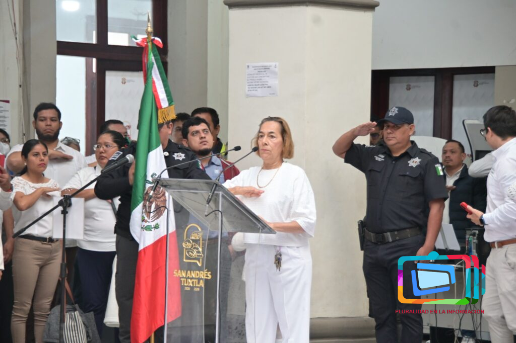 San Andrés Tuxtla, Ver., 24 de febrero de 2026.- El presidente municipal Rafa Fararoni Magaña y el cuerpo edilicio de San Andrés Tuxtla encabezaron el homenaje por el «Día de la Bandera» en bajos de Palacio Municipal.