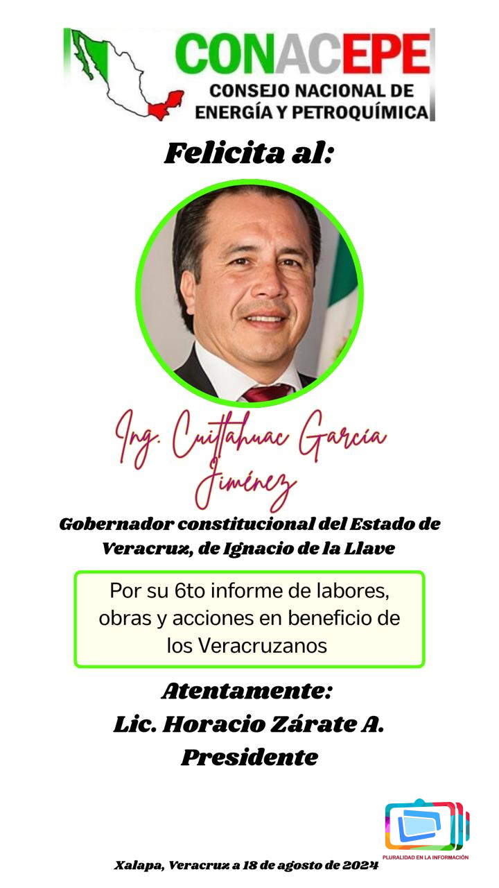CONACEPE felicita al Gobernador por su 6° Informe Xalapa, Veracruz a 18 de agosto de 2024.- El Consejo Nacional de Energía y Petroquímica a través de su representante el Lic. Horacio Zárate A., felicita al Gobernador de Veracruz Cuitláhuac García por su sexto informe de labores.