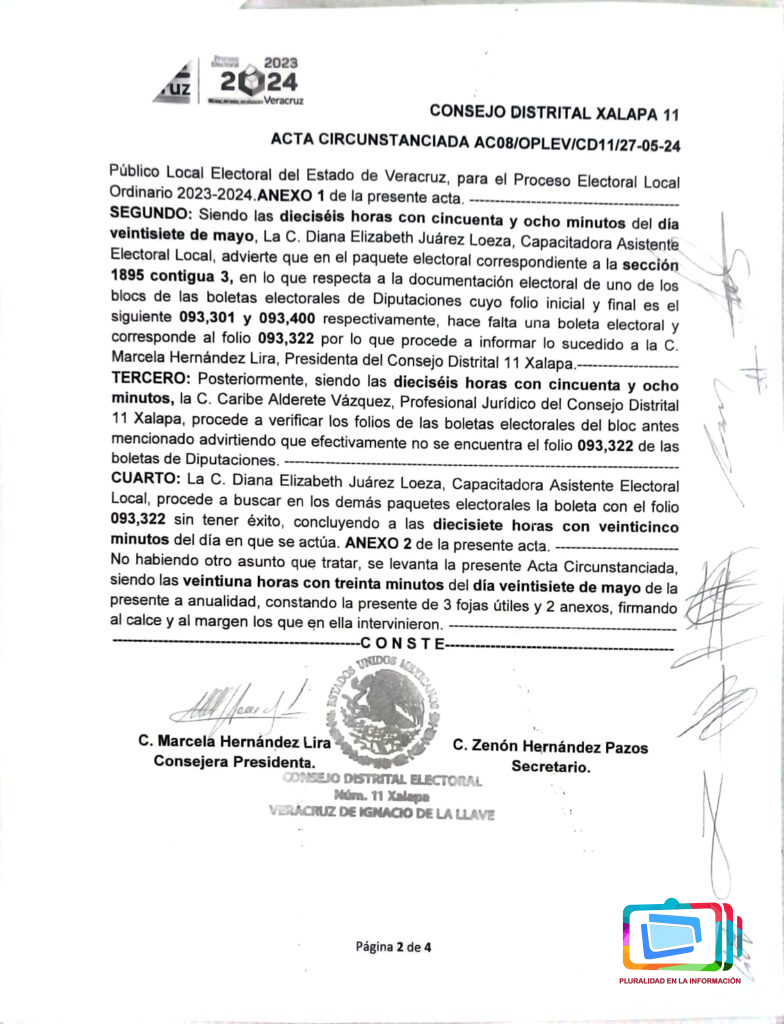 «Son dos boletas que están extraviadas fuera del distrito 11 de Xalapa y corresponde una boleta para gobernador y una boleta para diputado local. No existe una razón jurídica y lógica Por lo cual estas boletas hubiesen estado desprendidas o fueron sacadas del paquete que tenía que entregarse a los que van a ser presidentes de casilla», acusó.