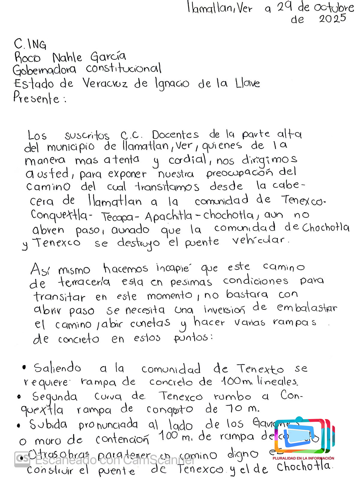 Ilamatlán, Veracruz a 31 de octubre de 2025.- Maestros de la parte alta del municipio de Ilamatlán dirigieron un escrito a la gobernadora de Veracruz, Rocío Nahle García, para solicitar la rehabilitación urgente del camino que conecta a la cabecera municipal con diversas comunidades serranas, luego de los daños severos ocasionados por las recientes lluvias.