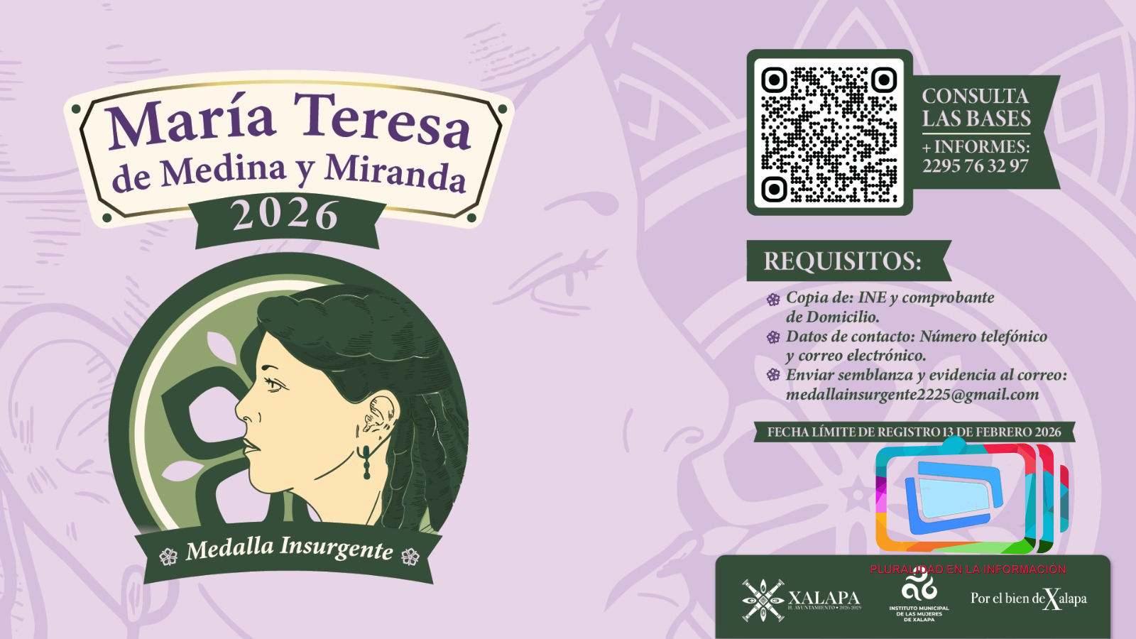 Xalapa, Ver., 19 de enero de 2026.- Con el fin de reconocer la trayectoria y trabajo en favor de la igualdad de género, la promoción y la defensa de los derechos de las mujeres, el Ayuntamiento, a través del Instituto Municipal de las Mujeres de Xalapa (IMMX), invita a la ciudadanía a participar en la convocatoria de la medalla insurgente “María Teresa de Medina y Miranda 2026”.
