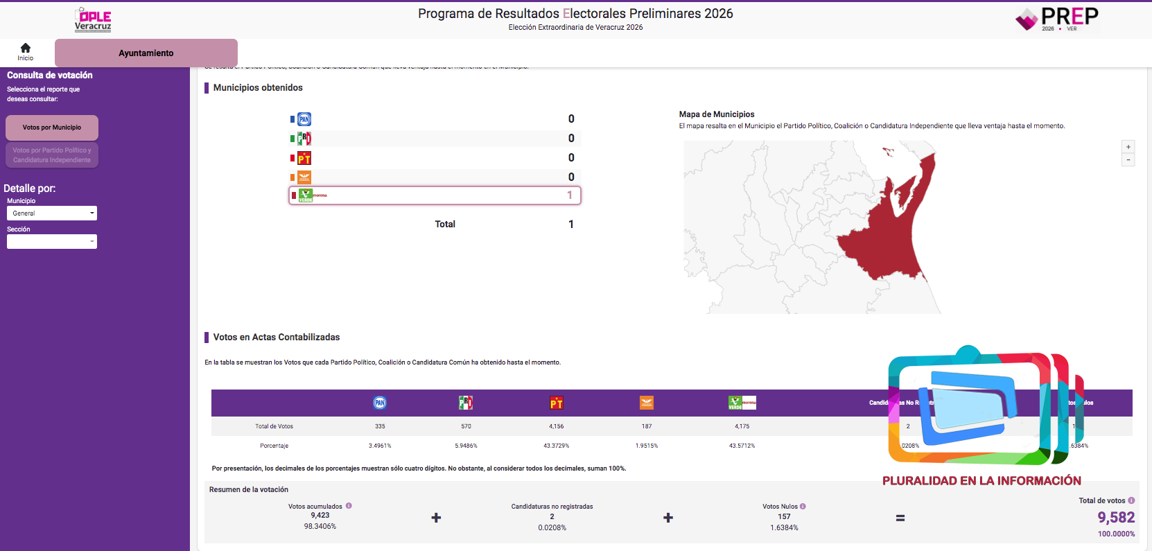 Durante la Sesión Permanente de Vigilancia de la Jornada Electoral para el Proceso Electoral Local Extraordinario 2026 (PELE 2026), la Consejera Presidenta del Organismo Público Local Electoral del Estado de Veracruz (OPLE Veracruz), Marisol Alicia Delgadillo Morales, resaltó el interés y cultura democrática que demostraron los tamiahuenses al, de nueva cuenta, salir a las urnas, reflejándose un 57.17 por ciento de participación ciudadana.