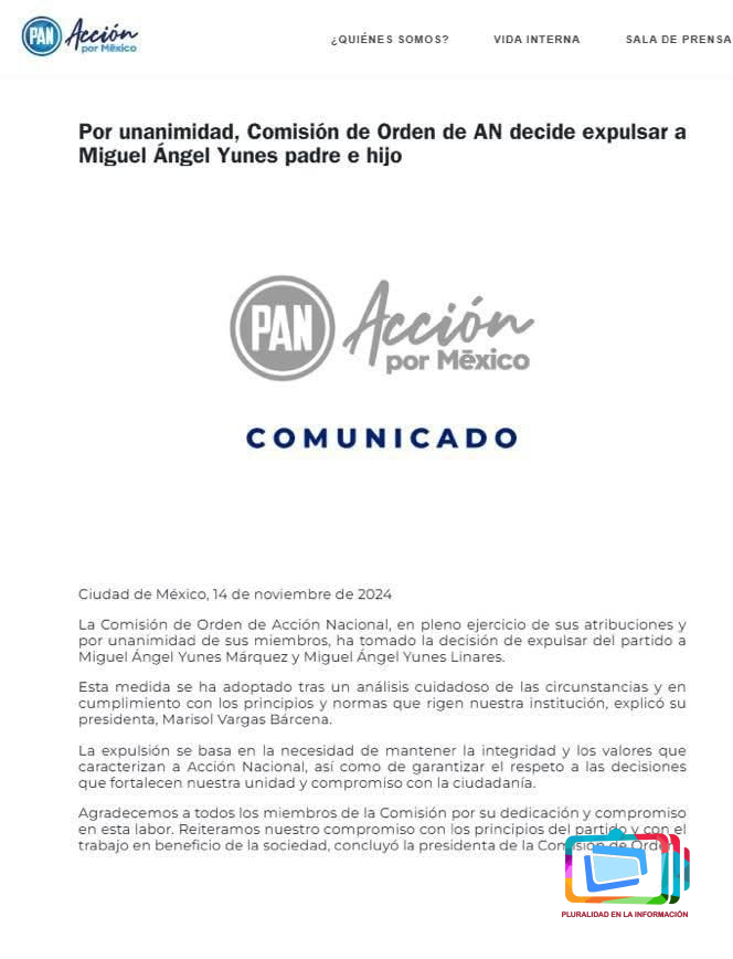 La expulsión se basa en la necesidad de mantener la integridad y los valores que caracterizan a Acción Nacional, así como de garantizar el respeto a las decisiones que fortalecen nuestra unidad y compromiso con la ciudadanía.