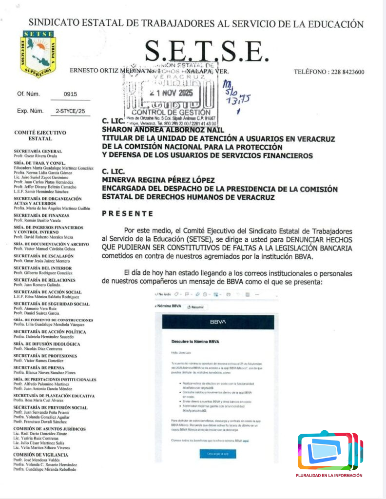 Xalapa, Veracruz a 22 de noviembre de 2025.- El Sindicato Estatal de Trabajadores al Servicio de la Educación (SETSE), encabezado por el profesor Óscar Rivera Ochoa, denunció que el banco BBVA estaría generando cuentas de nómina sin consentimiento de empleados de la Secretaría de Educación de Veracruz (SEV), lo que podría constituir violaciones a disposiciones bancarias, normativas financieras y derechos humanos.