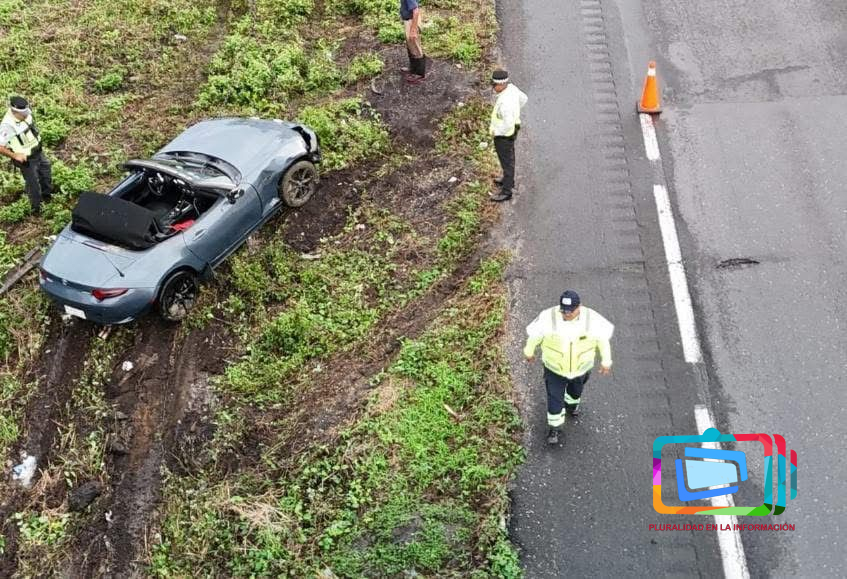 De acuerdo con los reportes, el conductor de un Mazda MX-5, color gris, modelo 2020, perdió el control de la unidad debido al pavimento mojado, impactándose contra el muro central y saliendo posteriormente del camino, hasta quedar en una cuneta dentro del derecho de vía.