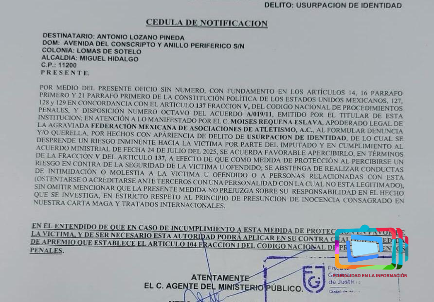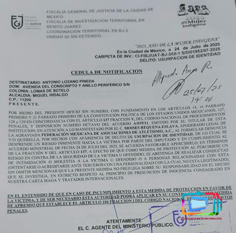 CIUDAD DE MÉXICO, 28 de julio de 2025.- La Fiscalía General de Justicia de la Ciudad de México (FGJCDMX), giró medidas precautorias contra Antonio Lozano Pineda y todo su Consejo Directivo, para no ostentarse, ni organizar eventos a nombre de la Federación Mexicana de Asociaciones de Atletismo (FMAA).