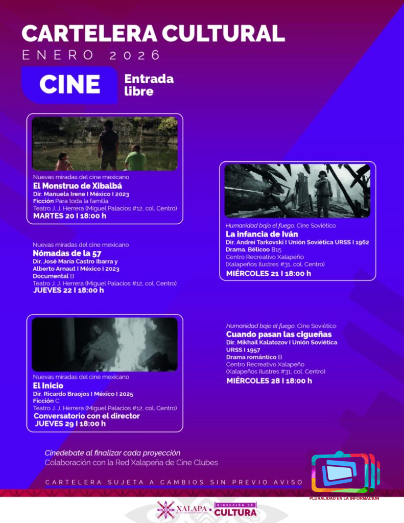 En el Teatro J. J. Herrera, el próximo martes a las 18:00 horas, se proyectará “El Monstruo de Xibalbá”, y el jueves 22 de enero, “Nómadas de la 57”. El jueves 29 de enero se exhibirá “El Inicio”. En el CRX, los miércoles, a las 19:00 horas, se proyectarán las películas “La infancia de Iván” y “Cuando pasan las cigüeñas”, como parte del ciclo “Humanidad bajo fuego, cine soviético”.