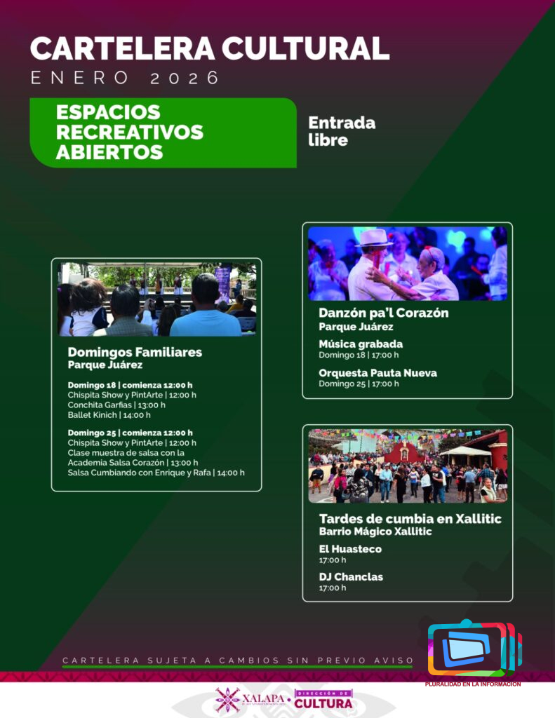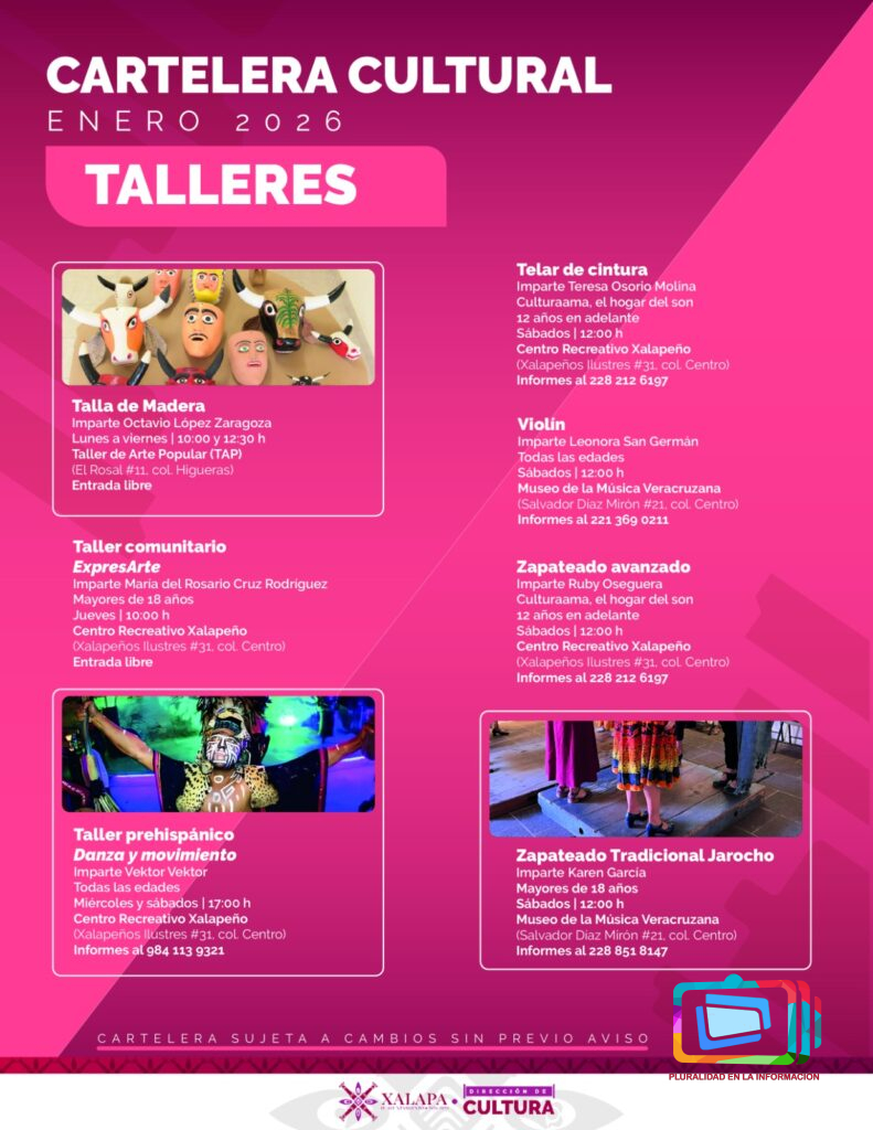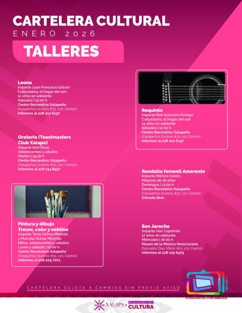 Xalapa, Ver., 16 de enero de 2026.- Talleres, cine, música y más incluye la agenda cultural que organiza el Ayuntamiento de Xalapa para recreación de las familias, en distintos recintos y espacios públicos.