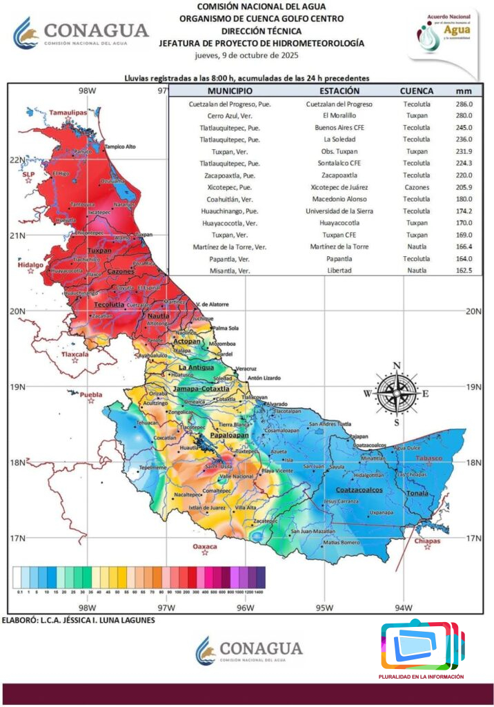 Xalapa, Veracruz a 9 octubre de 2025.- La Jefa del Proyecto de Hidrometeorología del Organismo de Cuenca Golfo Centro de la Comisión Nacional del Agua (CONAGUA), Jessica Iveth Luna Lagunés emitido un informe sobre el estado de los ríos y arroyos en Veracruz, donde se registran desbordamientos e incrementos en los niveles de agua debido a las lluvias acumuladas en las últimas 24 horas de 8 a 8.