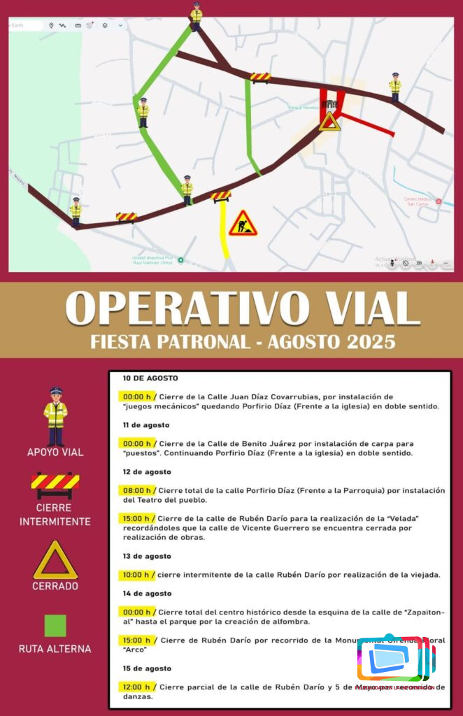 El 15 de agosto a las 12:00 horas habrá cierre total de la calle de Rubén Darío y 5 de Mayo por recorrido de danzas.