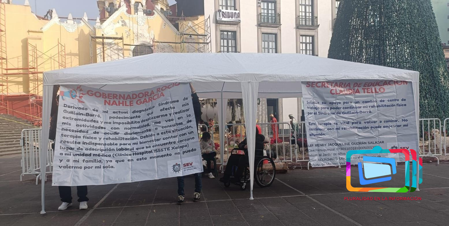 Xalapa, Veracruz a 7 de enero de 2026.- Wendy Jakelin Guzmán Salazar, maestra del nivel preescolar, se manifestó este martes en Plaza Lerdo para solicitar un cambio de centro de trabajo por motivos de salud, luego de que las autoridades educativas declararan improcedente su petición, pese a que padece el síndrome de Guillain-Barré, una enfermedad neurológica que afecta severamente su movilidad.