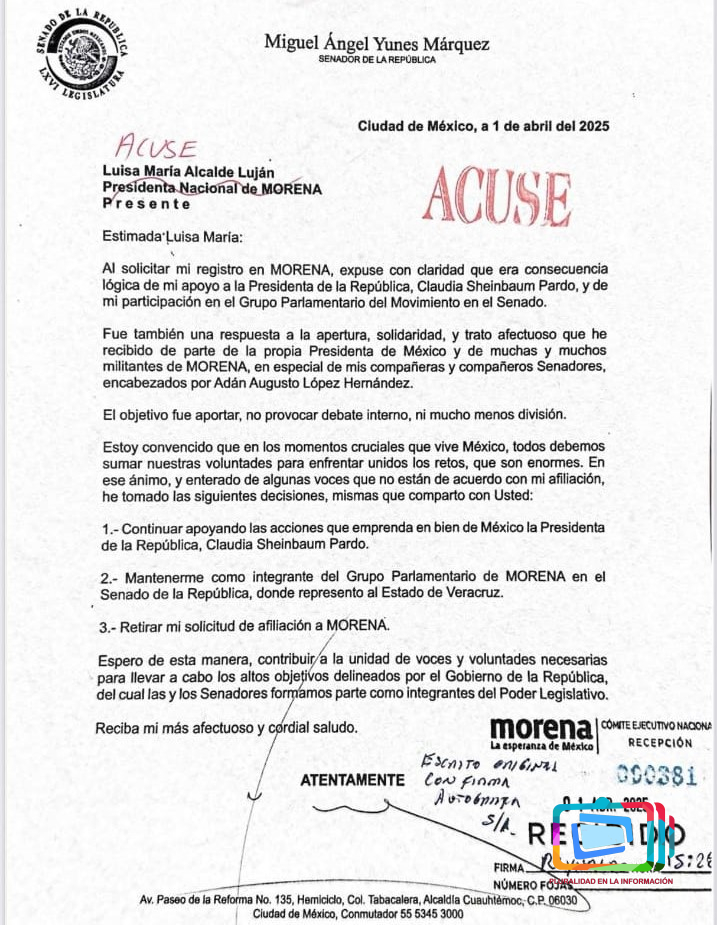 El senador de la República, Miguel Ángel Yunes Márquez, retiró su solicitud de afiliación a Morena.