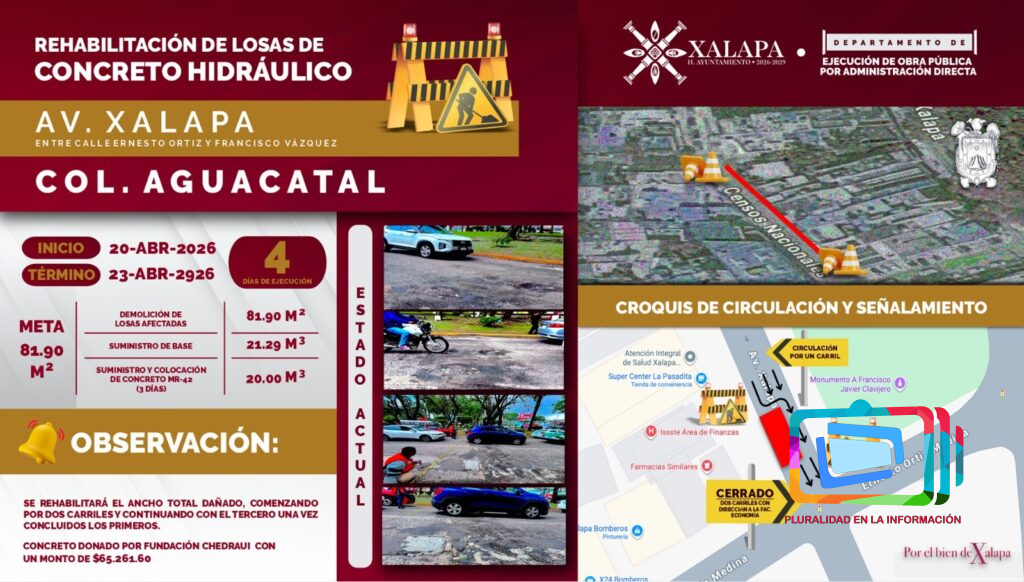 Xalapa, Ver., 21 de abril de 2026.- El Ayuntamiento de Xalapa informa que se mantiene el cierre parcial de la avenida Xalapa, en el tramo comprendido entre las calles Ernesto Ortiz Medina y Francisco Vázquez, en la colonia Aguacatal, debido a los trabajos de rehabilitación de losas de concreto hidráulico.