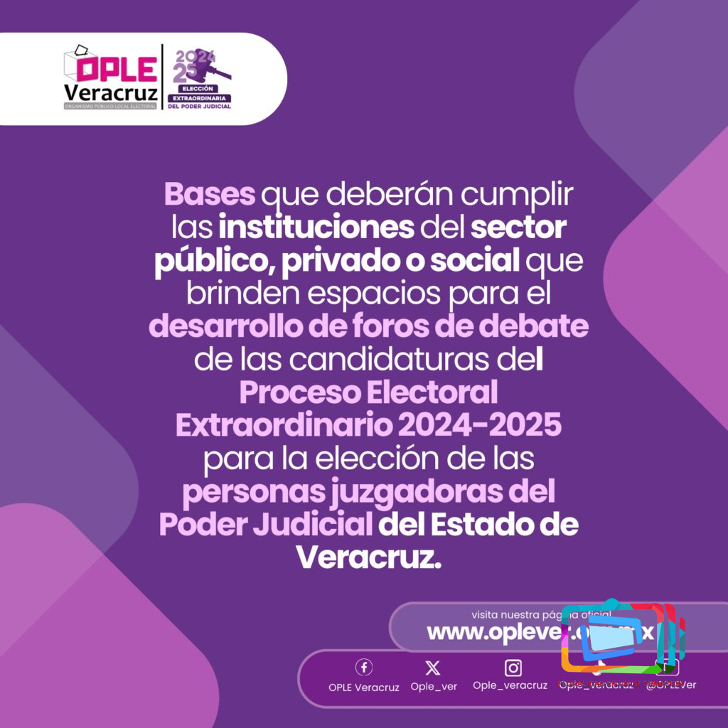Xalapa, Veracruz, 04 de abril de 2025. El Organismo Público Local Electoral del Estado de Veracruz (OPLE Veracruz) dio a conocer las bases que deberán cumplir las instituciones del sector público, privado o social que brinden espacios para el desarrollo de foros de debate de las candidaturas para el Proceso Electoral Local Extraordinario 2024-2025 para la elección de personas juzgadoras del Poder Judicial del Estado de Veracruz.