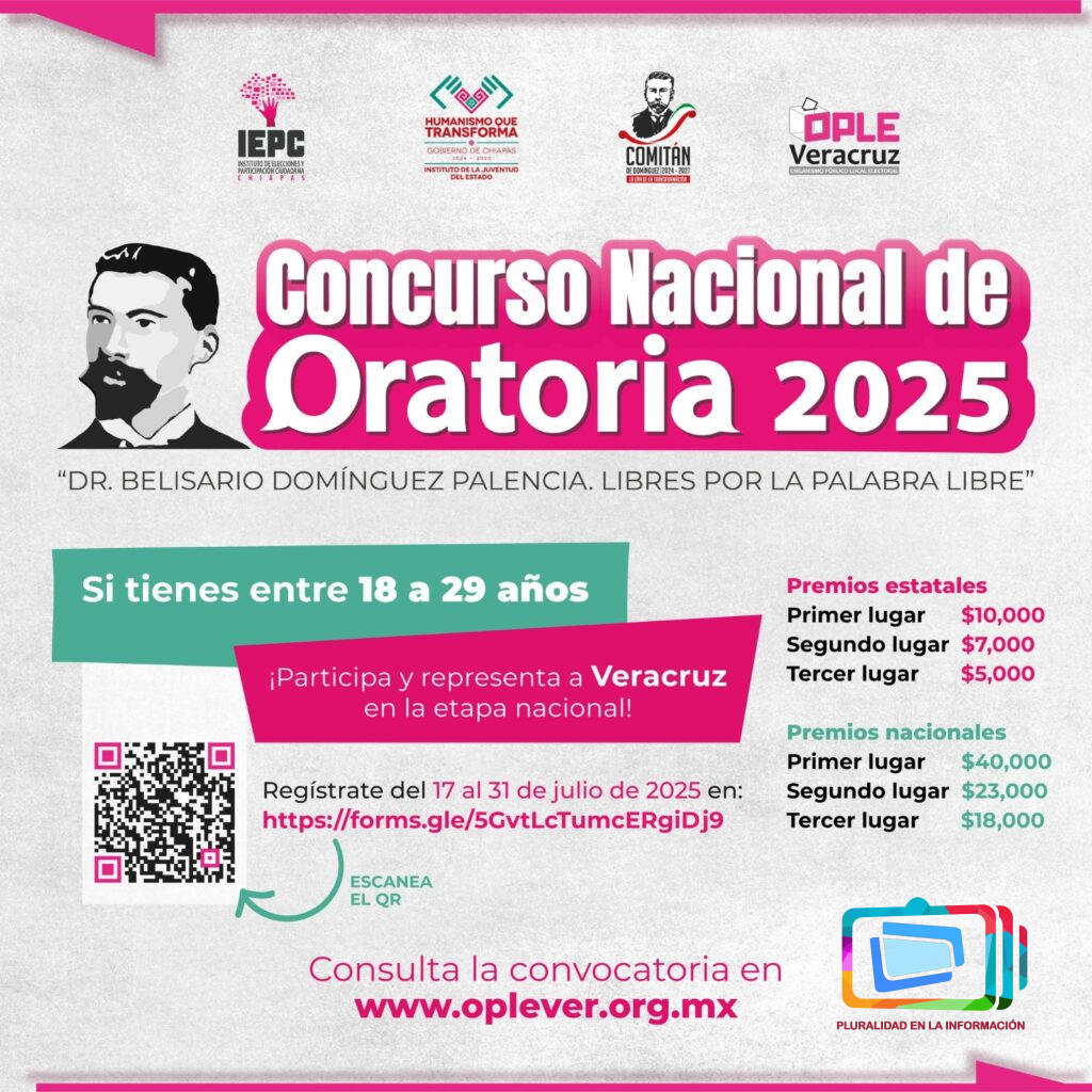 Xalapa, Veracruz, 28 de julio de 2025. Como cada año, el Organismo Público Local Electoral del Estado de Veracruz (OPLE Veracruz) invita al Concurso Nacional de Oratoria 2025 “Dr. Belisario Domínguez Palencia. Libres por la palabra libre”, que convoca el Instituto de Elecciones y Participación Ciudadana de Chiapas (IEPC Chiapas), el Instituto de la Juventud del Estado de Chiapas (IJECH) y el Honorable Ayuntamiento de Comitán de Domínguez, Chiapas.