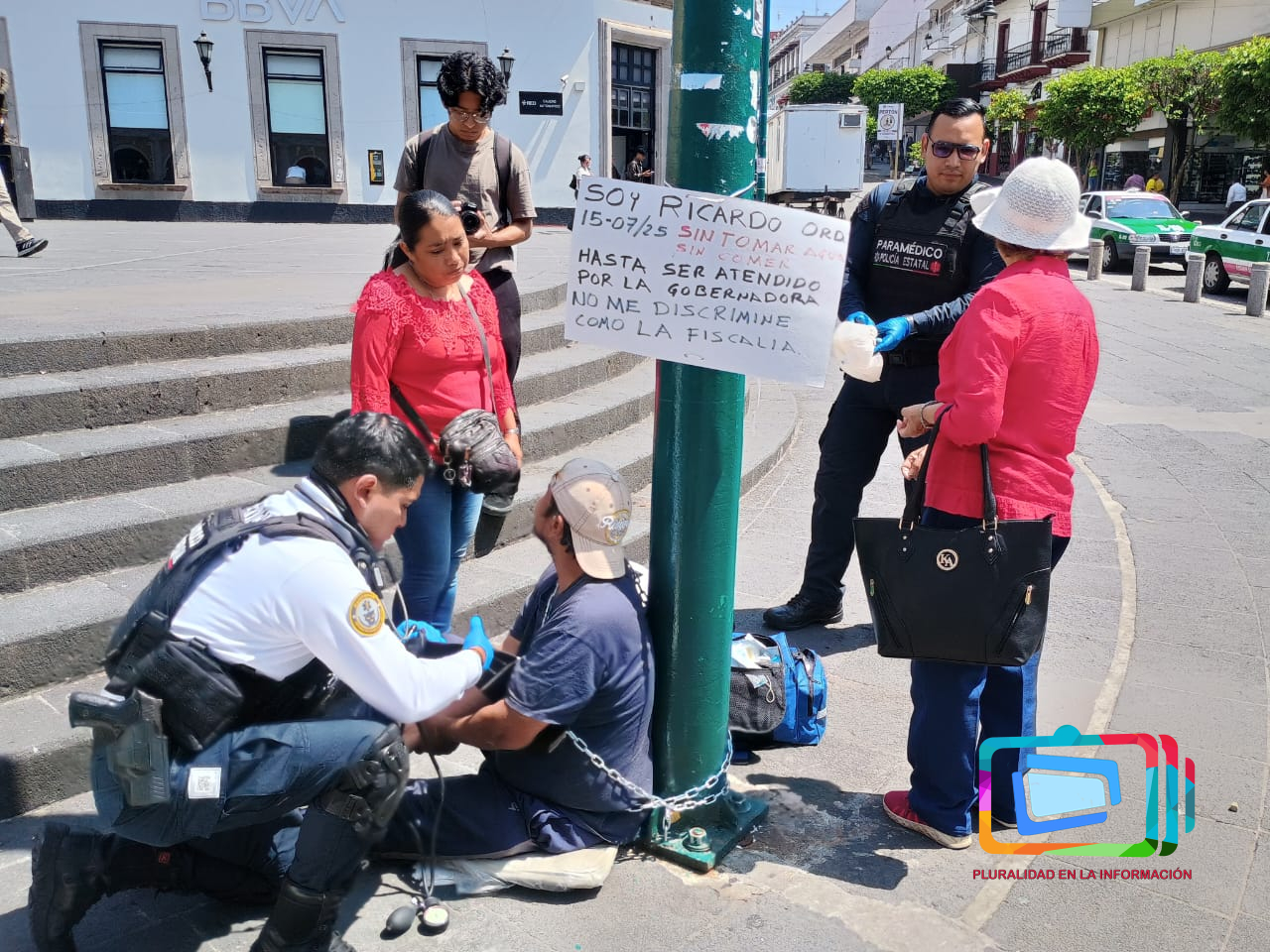 Xalapa, Veracruz a 16 de julio de 2025.- Debido a que presentaba un cuadro de deshidratación por continuar encadenado en el poste de una lámpara en la plaza Lerdo el señor Juan Ricardo Ordóñez Jerez, fue atendido por paramédicos de la SSP, pero se negaba a recibir la atención médica.