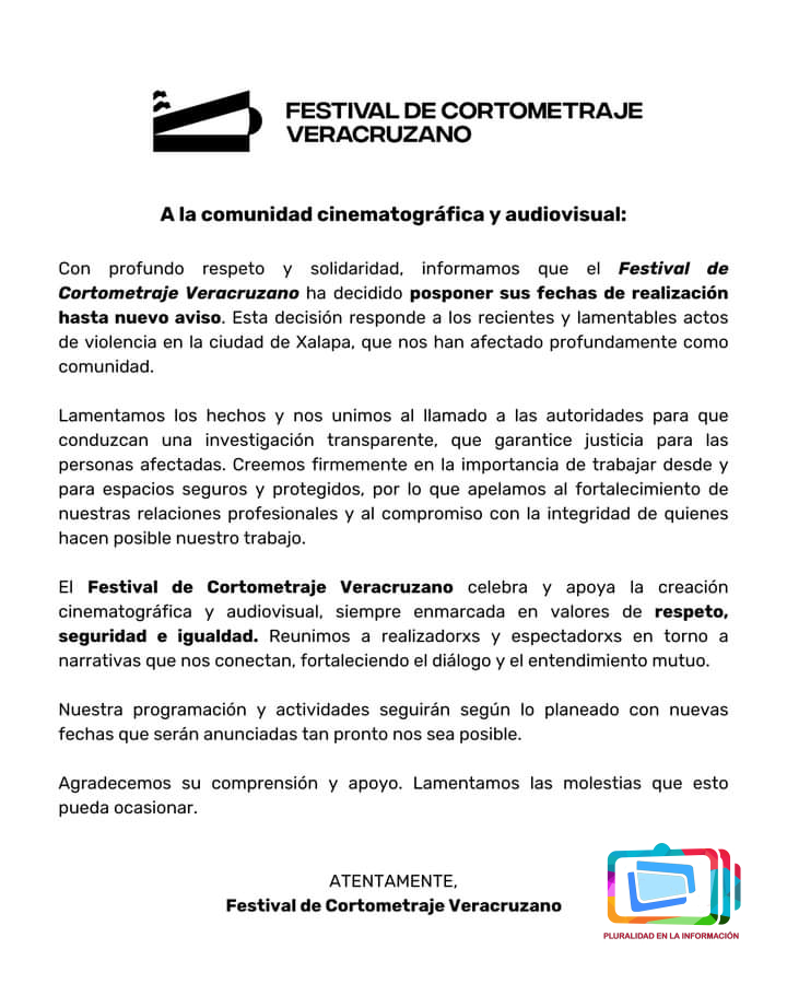 Con profundo respeto y solidaridad, informamos que el Festival de Cortometraje Veracruzano ha decidido posponer sus fechas de realización hasta nuevo aviso. Está decisión responde a los recientes y lamentables actos de violencia en la ciudad de Xalapa, que nos han afectado profundamente como comunidad.
