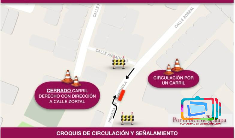 Durante el periodo de ejecución se aplicarán ajustes a la circulación vehicular, por lo que se mantendrá cerrado el carril derecho con dirección a la calle Zorzal, habilitándose el tránsito en un solo carril.