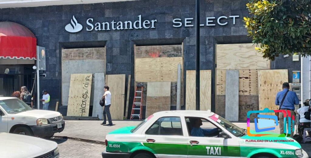 Xalapa, Veracruz a 31 de mayo de 2024.- A unas horas de la jornada electoral del domingo 2 de junio, el banco Santander, ubicado en la calle Enríquez, está colocando tablones para proteger sus cristales.