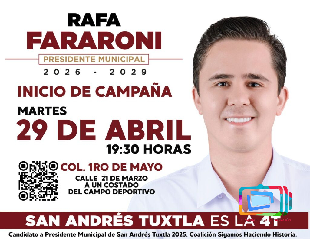 San Andrés Tuxtla, Veracruz a 28 de abril de 2025.- El candidato de la coalición Morena-Partido Verde a la presidencia municipal de San Andrés Tuxtla, Rafael Fararoni, iniciará su campaña este martes 29 de abril.