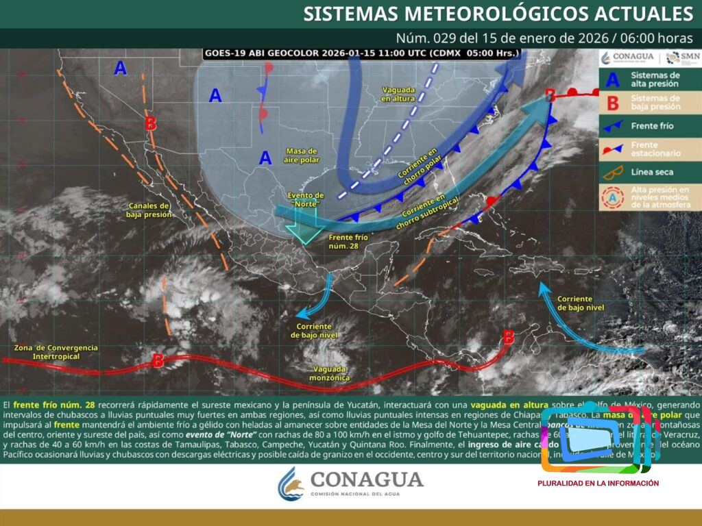 Xalapa, Veracruz a 15 de enero de 2026.- La jefa del Departamento de Hidrometeorología de la Comisión Nacional del Agua (CONAGUA), Jessica Ivette Luna Lagunés, informó que durante la madrugada de este jueves se registraron fuertes rachas de viento del norte en distintas regiones del estado de Veracruz, como efecto del Frente Frío número 28.