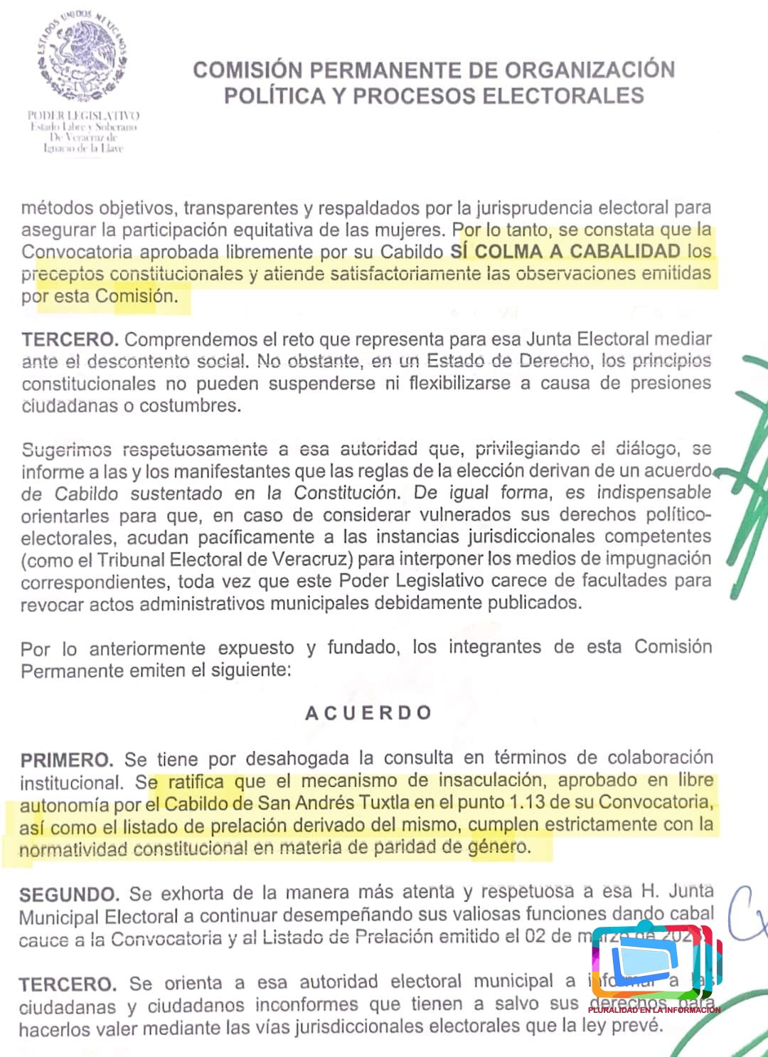 San Andrés Tuxtla, Ver., 7 de marzo de 2026.- En atención a las inquietudes expuestas por habitantes de comunidades de San Andrés Tuxtla, la Junta Municipal Electoral del H. Ayuntamiento solicitó al Congreso del Estado de Veracruz criterio orientador respecto a la Convocatoria aprobada por la autoridad municipal en sesión de cabildo en febrero del año en curso, en la que se garantiza los principios de paridad de género para la elección de agentes y subagentes municipales 2026.