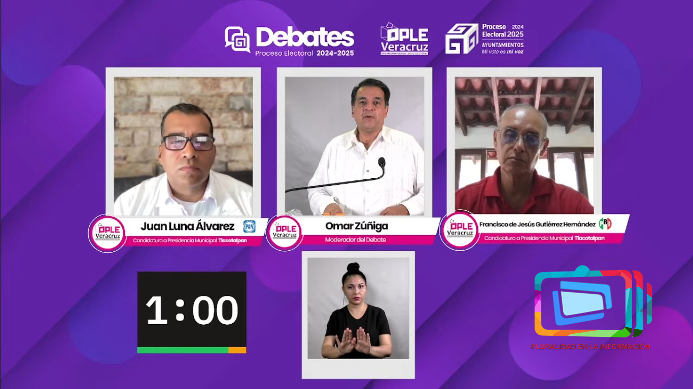 Tlacotalpan, Veracruz a 19 de mayo de 2025.- Se llevo a cabo el debate del Municipio de Tlacotalpan solo con dos contendientes el del PRI Francisco de Jesús Gutiérrez Hernández, y del Partido Acciona Nacional Juan Luna Álvarez, de los demás contendientes no se presentaron a debatir.