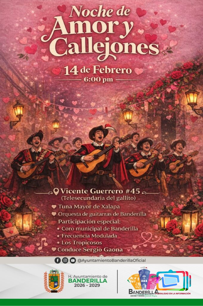 Banderilla, Ver., martes 10 de febrero de 2026.- Con motivo del Día del Amor y la Amistad, el gobierno de Banderilla, Ver., a través de la dirección de Cultura, llevará a cabo, por vez primera en el municipio, una callejoneada por diversas calles y callejones, así como una velada musical, con la participación de tunas, orquestas, coros, grupos de música popular y dos solistas ya reconocidas.