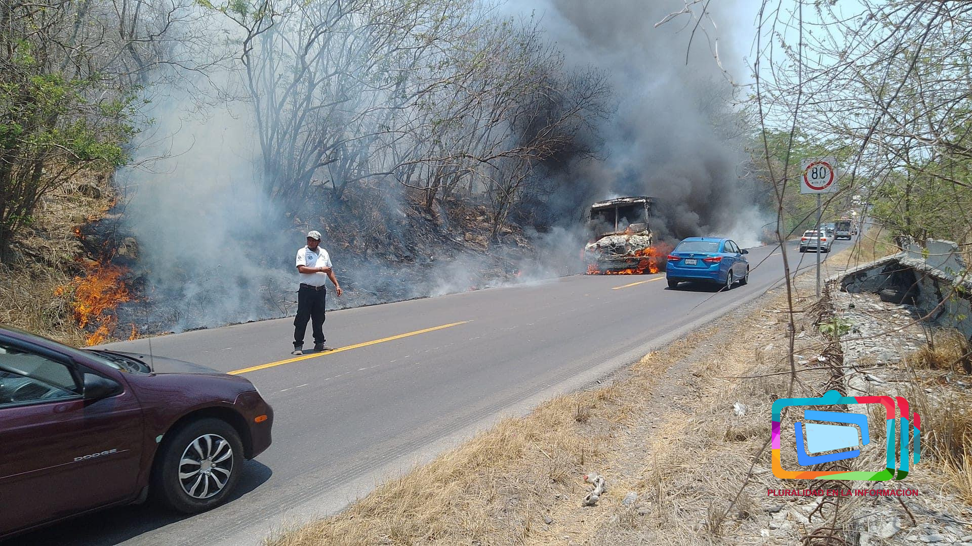Actopan, Veracruz a 17 de mayo de 2024.- Se incendia autobús de pasajeros y pastizales enfrente de la entrada de Villa Rica municipio de Actopan en este momento