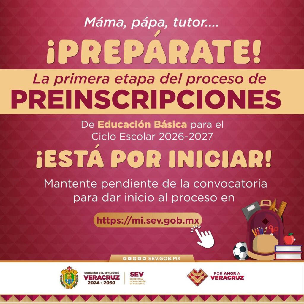 Xalapa, Ver., domingo 11 de enero de 2026.– En próximos días la Secretaría de Educación de Veracruz (SEV) dará a conocer la convocatoria para el proceso de preinscripciones de Educación Básica del ciclo escolar 2026–2027, por lo que convoca a madres, padres de familia y tutores a mantenerse atentos a la publicación oficial.