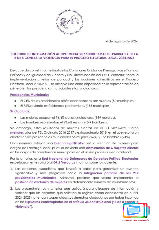 Xalapa, Veracruz a 15 de agosto de 2024.- La Red Nacional de Defensoras de Derechos Políticos-Electorales solicitó información al Organismo Público Local Electoral (OPLE), sobre temas de paridad y de la de 8 de 8 en contra de la violencia para el proceso electoral local del 2024-2025.