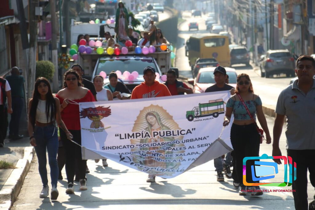 Trabajadores de limpia pública de Xalapa realizan su peregrinación saliendo de sus oficinas centrales en la avenida Rébsamen.