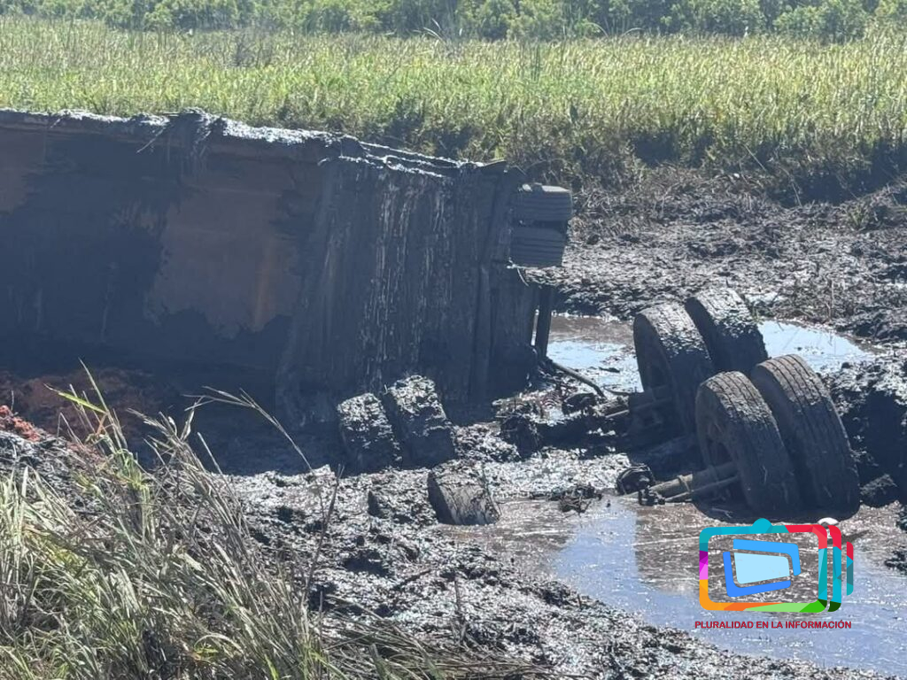 Minatitlán, Veracruz a 3 de abril de 2025.- Un trágico accidente ocurrió en la carretera Minatitlán-Coatzacoalcos, en el tramo conocido como “Las Matas”, donde un tráiler de doble remolque terminó volcado y parcialmente sumergido en una zona pantanosa.