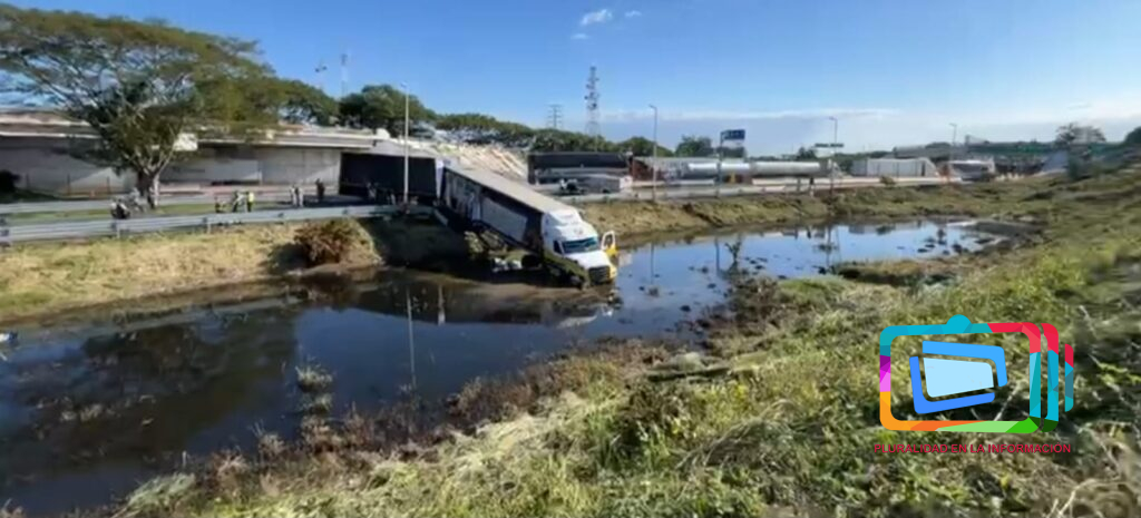 Tráiler cargado de cervezas brinca la valla y cae a laguna