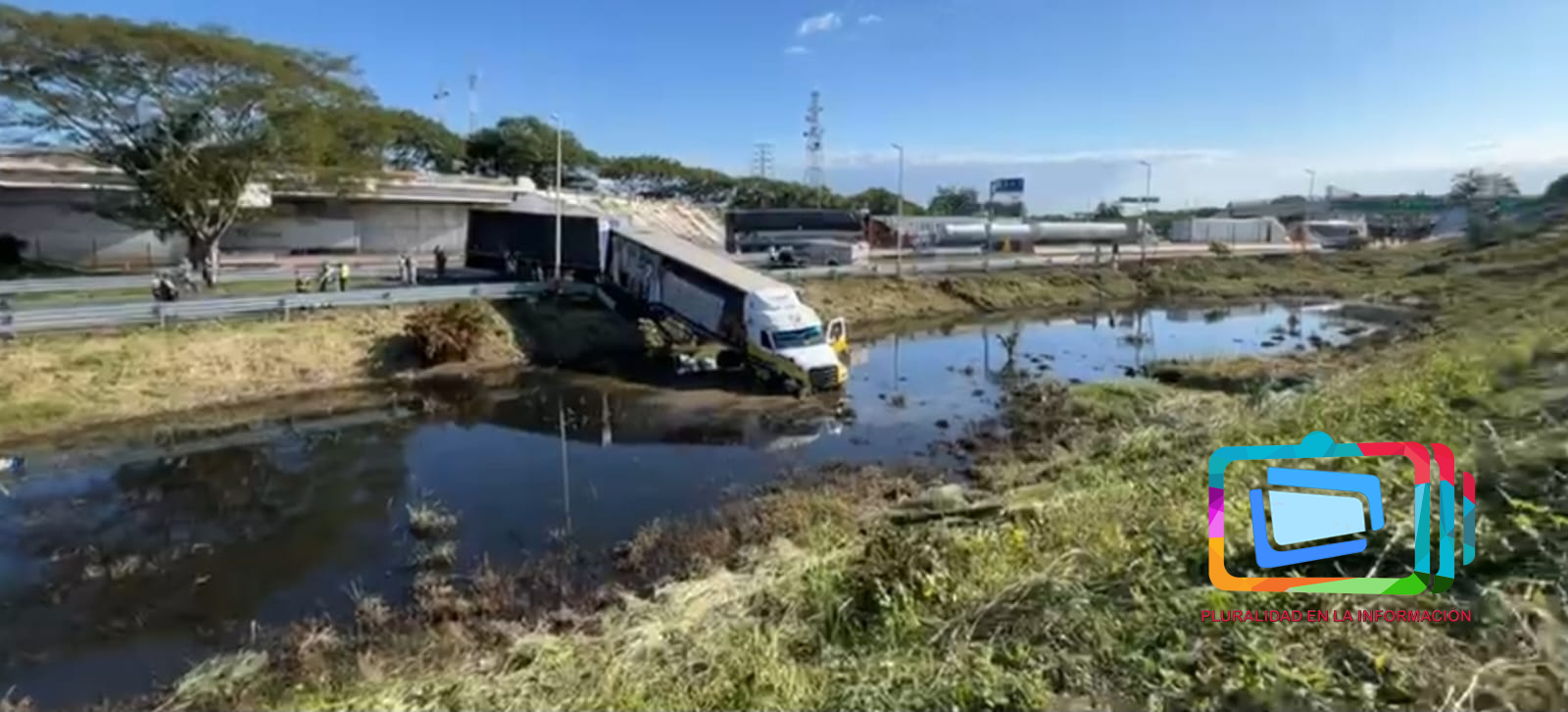 Tráiler cargado de cervezas brinca la valla y cae a laguna