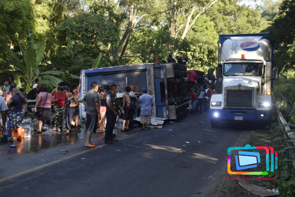 San Andrés Tuxtla Veracruz a 12 de septiembre de 2024.- Un tráiler que transportaba 30 toneladas de refrescos y bebidas pertenecientes a la empresa Pepsi, volcó alrededor de las 16 horas de este jueves sobre el kilómetro 130 de la carretera federal 180, sobre la entrada a la comunidad de Los Pinos.